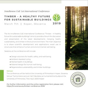 The 1st InnoRenew CoE International Conference “Timber – A healthy future for sustainable buildings” aims to provide a forum for discussion and presentation of the latest developments merging health, sustainability, and timber in the built environment. The main objective is to share scientific development and applications wood use in structures that enhance human and environmental well-being. Sessions at the conference will include: