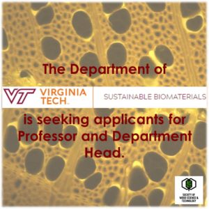 The Department of Sustainable Biomaterials at Virginia Tech is seeking applicants for professor and department head. This is a full-time, 12-month, 100 percent administrative, tenure-track position with a start date of January 1, 2020.