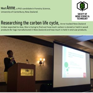 Anne pictured in 2019 SWST International Convention at Yosemite, California, USA. Flew from New Zealand, Anne presented her research on Carbon Stocks of End Use Products. Her presentation can be seen here.