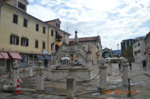 Prešernov trg: The square is lined with colorful buildings.  The 17th-century Italian family who erected the fountain in Prešernov trg was named Da Ponte; thus it is shaped like a bridge (ponte in Italian).  The fountain that looks much like a miniature version of Venice’s Rialto Bridge.  At the square’s southern end is the Muda Gate. Erected in 1516, it’s the last of a dozen such entrances to remain standing. On the south side of the archway you’ll see the city’s coat of arms with a radiating sun, the face of a youth in a sunburst.  This was once the main gate of the old city wall, and visitors had to pay a toll to enter.