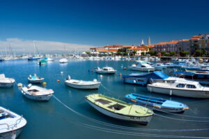 Koper is a town of a hundred suns which adorn the medieval Venetian palaces.  It is a port city in Slovenia, on the country’s Adriatic coastline. Koper is Slovenia’s main cruise ship port and is located just a few miles from the city of Trieste, Italy. First established during the Roman Empire, the port of Koper has played an important role in the development of the area. It is among the largest in the region and is one of the most important transit routes for goods heading from Asia to central Europe. In contrast with other European ports, which are managed by port authorities, the activities of the Port of Koper comprise the management of the free zone area, the management of the port area, and the role of terminal operator. Its medieval old town centers around Titov Trg, a square with Venetian-influenced landmarks such as the Praetorian Palace and a Gothic-style loggia, while nearby Da Ponte Fountain is a replica of Venice’s famed Rialto Bridge. Rebuilt many times, the circa-12th-century Cathedral of the Assumption features a tall campanile with sweeping bay views.