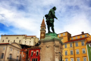 Tartini Square is the main square in Piran. It is named after Guiseppe Tartini, an Italian composer and violinist, who was born here and you can visit his frescoed  Tartini House.On three sides, colorful buildings surround the square. The fourth side of the square opens up to the harbor.  Until the end of the 19th century, the square was filled with water and this was part of the original port. In 1894, platforms were added and more buildings were constructed, forming the square as we see it today.  The 19th-century town hall has a stone lion, a symbol of the former Republic of Venice.